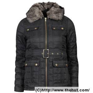 Brave Soul Women's Quilted Belted Jacket with Fur Trim - Black