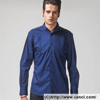 禹化折角方口领长袖压褶衬衫 藏青色