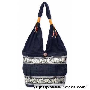Black Elephant ParadeBlack Cotton Should Bag from Thailand
