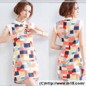 2013 韩版新款翻领彩色格子拼色无袖连衣裙 6886#