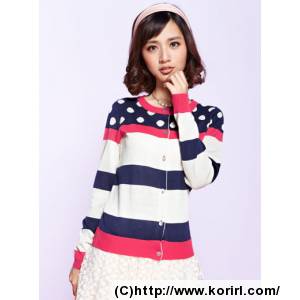 キュートウェーブドット間カラーバーオープンラウンドカラー長袖セーター。